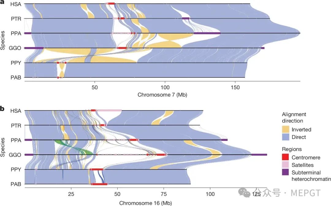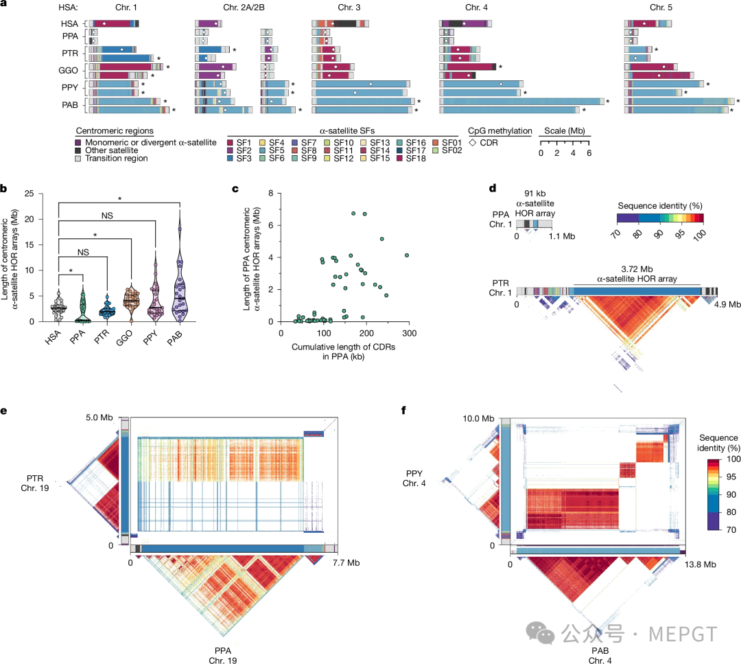 在他们的研究中,Yoo等人描述了大多数猿类染色体的完整着丝粒组成。他们描述了物种之间和物种内部在长度和序列组成上的广泛变异,这部分是快速和近期进化的结果。例如,倭黑猩猩中约40%的着丝粒在最多一百万年前减少了约300倍,导致该谱系特有的“迷你着丝粒”。类似地,尽管婆罗洲和苏门答腊猩猩在相对较近的96万年前才分化,但约五分之一的婆罗洲猩猩染色体包含新出现的高阶阵列,而苏门答腊猩猩则没有,体现了这些区域在短暂进化时期内的变化。