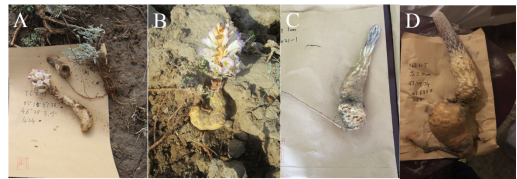 (A:新疆裕民县盛花期盐生肉苁蓉及其寄主聚头绢蒿;B:新疆哈巴河县盛花期盐生肉苁蓉及其寄主驼绒藜;C:新疆伊吾县出土期的盐生肉苁蓉;D:新疆巴里坤县出土期的盐生肉苁蓉)
